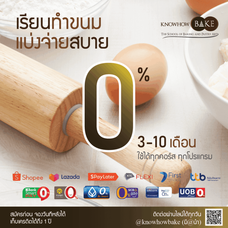 โรงเรียนสอนทำเบเกอรี่ KNOWHOWBAKE เหมาะสำหรับทุกเพศ ทุกวัย ทุกคนที่สนใจเรียนรู้การทำเบเกอรี่ ไม่ว่าจะเป็นมือใหม่ที่ไม่มีพื้นฐาน หรือผู้ที่มีประสบการณ์แล้วที่ต้องการพัฒนาทักษะเพิ่มเติม เรายังมีคอร์สเรียนเฉพาะทาง เค้ก ขนมปัง คุกกี้ เพสทรี่ มีขนมอบครบทุกประเภท มีขนมเหมาะสำหรับทุกคน ตั้งแต่ระดับง่าย-ยาก