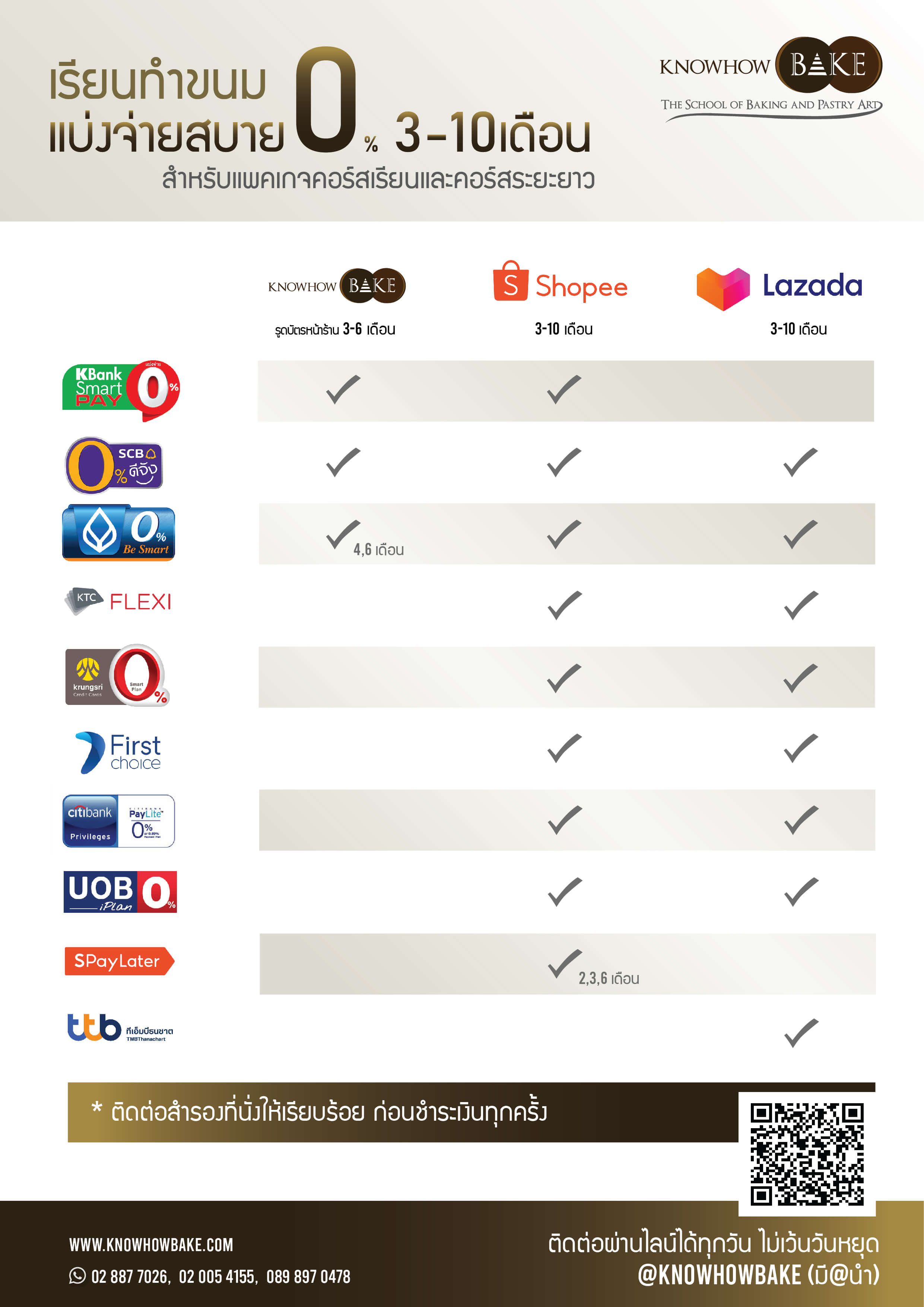 - ชำระผ่านบัตรเครดิตออนไลน์ – จองและแจ้งขอลิงค์กับเจ้าหน้าที่ได้ทางLINEat: @KNOWHOWBAKE (*สิทธิพิเศษ ผ่อน0% 3-10เดือน ผ่านบัตรเครดิตที่ร่วมรายการ)